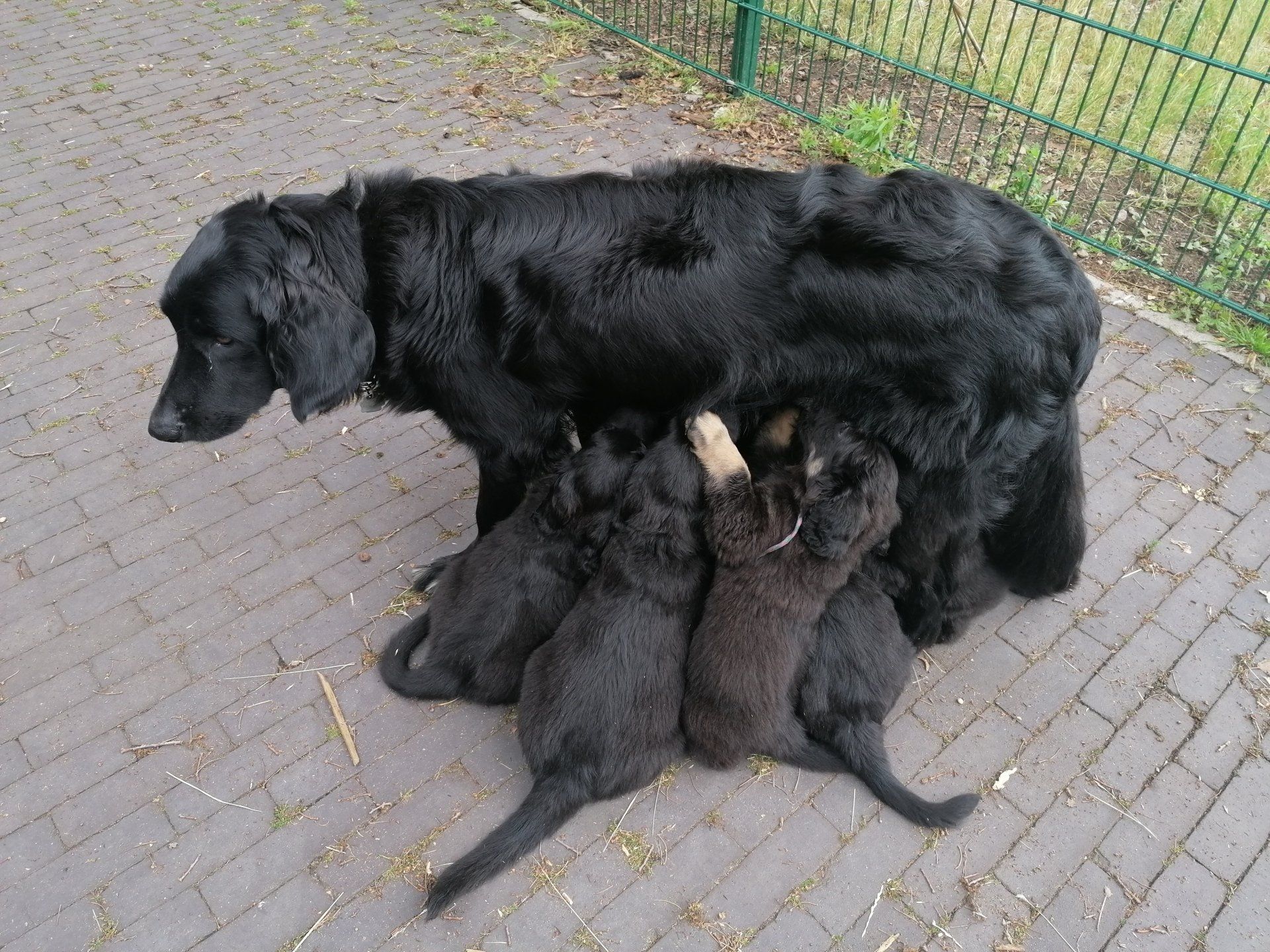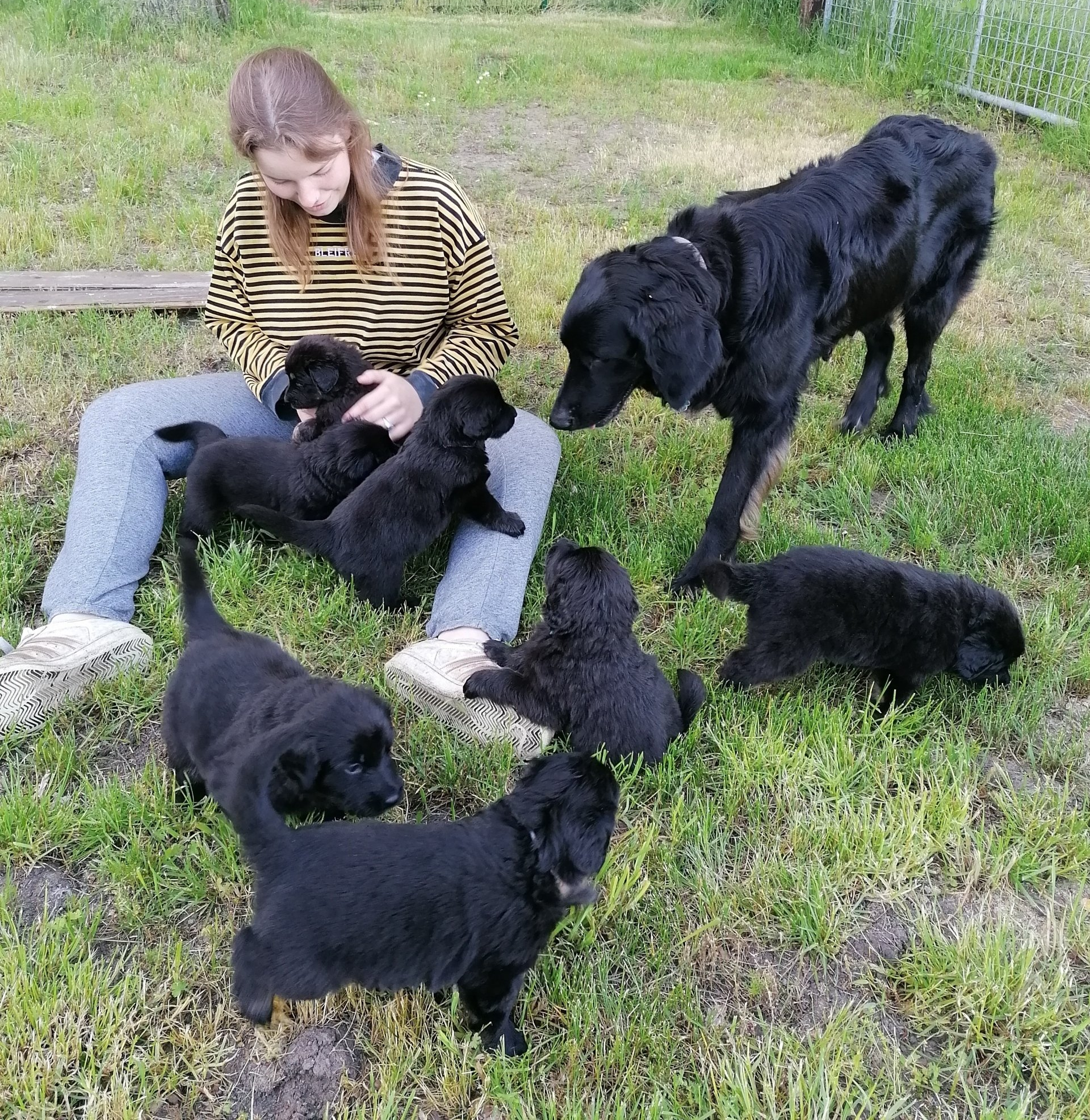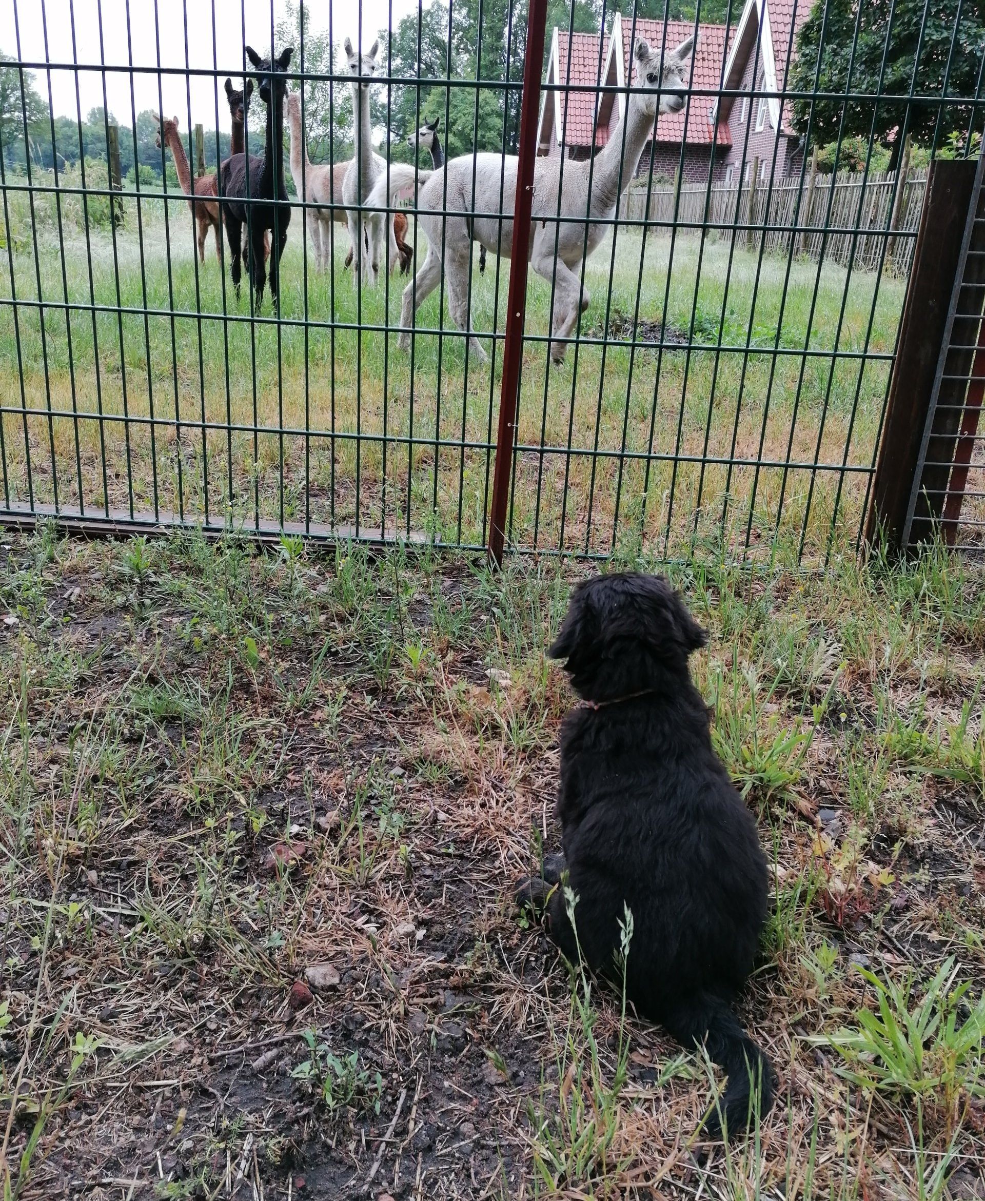 Action pur im Welpenauslauf: Erst von Mama Alva zeigen lassen, wie man perfekt auf einem Stöckchen kaut. Dann das erlernte Wissen selbst anwenden....oder doch lieber aus Langeweile auf Mama rumklettern. Und am Ende noch gemütlich gucken was da für seltsame Tiere vor dem Zaun stehen und neugierig sind.